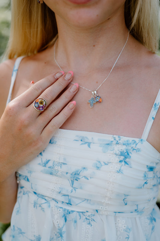 Tiny Cross and Oval Pendant Bundle with Forget Me Nots and Wildflowers